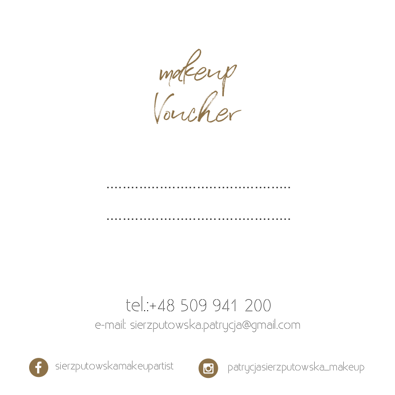 W mojej ofercie znajduje się spersonalizowany Voucher prezentowy na makijaż okazjonalny, pakiet ślubny lub indywidualne szkolenie.